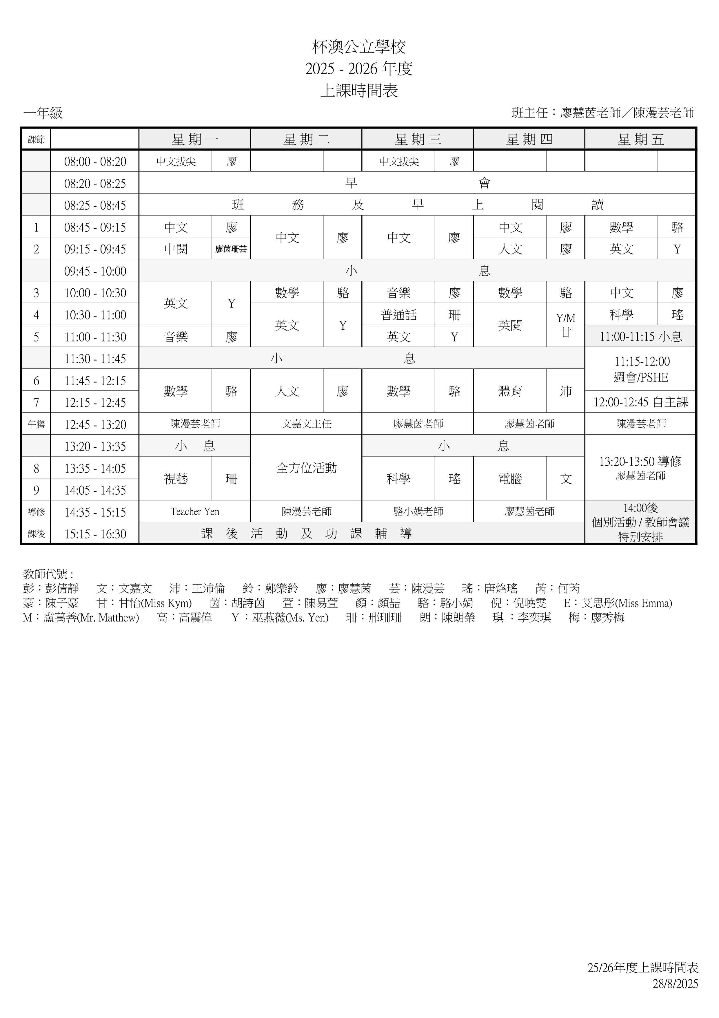P1上課時間表