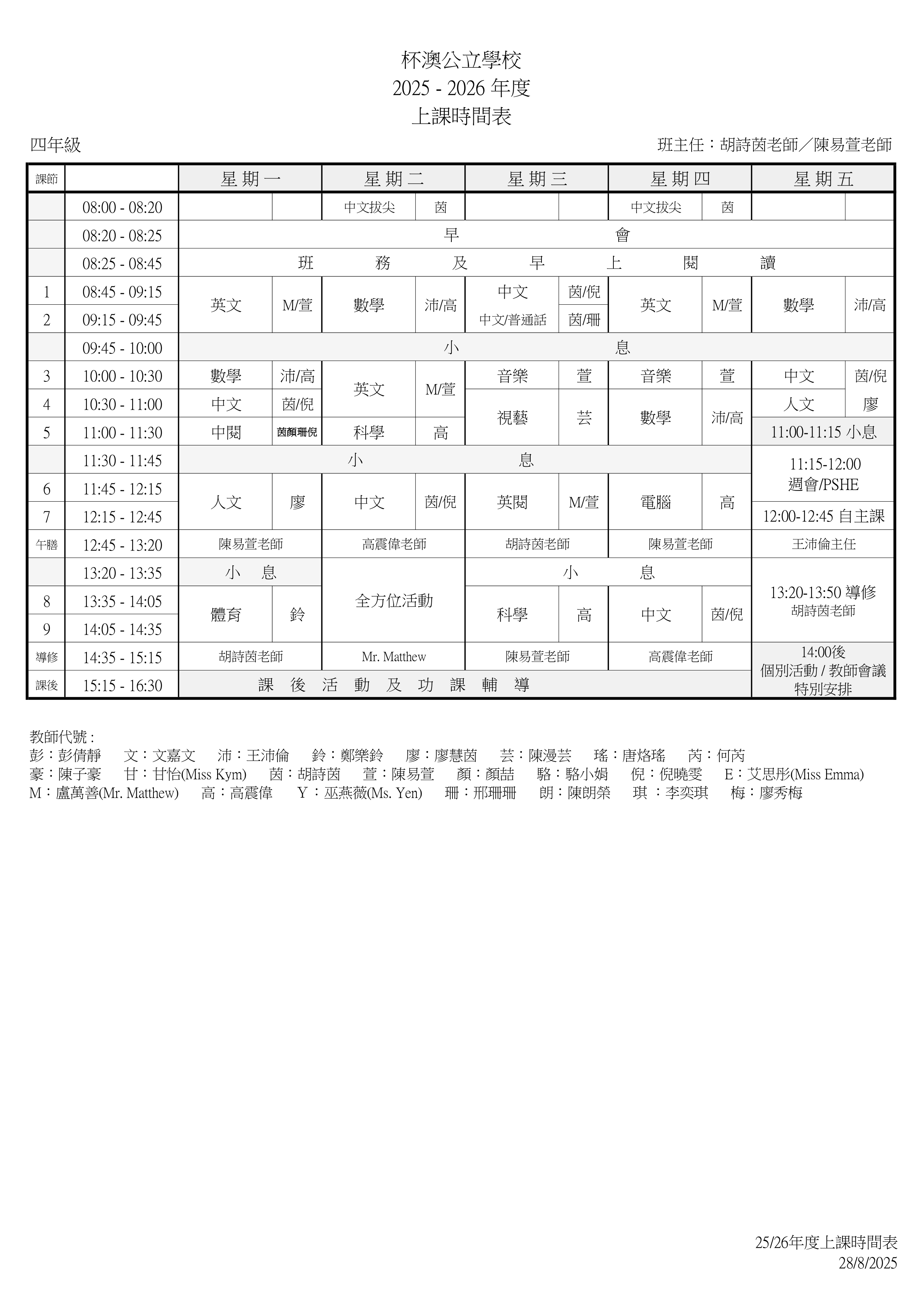 P4上課時間表