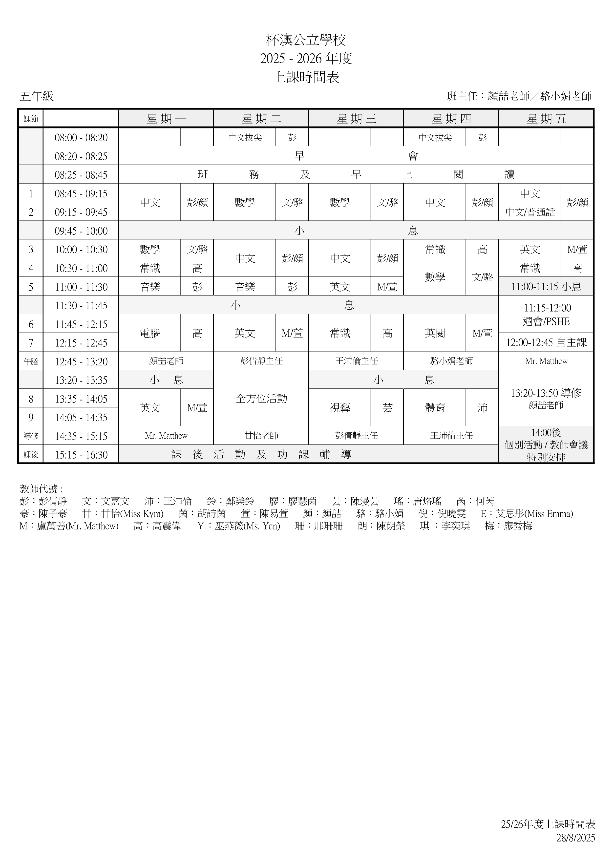 P5上課時間表